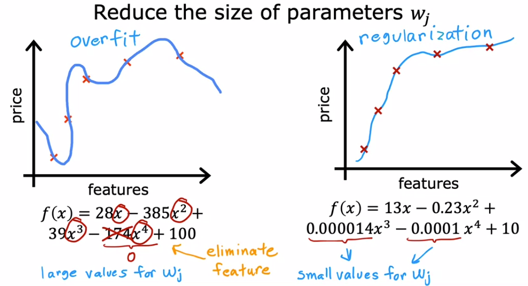 تو تصویر بالا نشون داده شده که با اعمال ضریب های (w) کوچک امتحان میکنیم که آیا حذف یک متغیر دارای توان به حل مشکل ما کمک میکند یا خیر، از آنجایی که مقادیر w و b را سیستم بطور اتوماتیک تعیین میکند و ما در آنها نقشی نداریم لذا با استفاده از روش زیر، سیستم را مجبور به انتخاب اعداد کوچک برای ضریب های (w) دلخواه خود میکنیم: