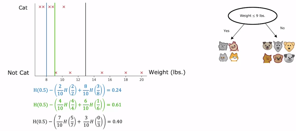 حالا وقتی میخوایم از فرمول entropy برای decision trees استفاده کنیم، باید entropy هر طرف رو حساب کنیم، میانگینش رو بدست بیاریم (میانگین بر اساس تعداد دیتاهای هر سمت) و آخرسر نتیجه رو از entropy اولیه دیتا ست کم کنیم، به این فرمول میگن فرمول information gain که هرچقدر حاصل فرمول information gain بیشتر باشه یعنی گزینه بهتریه. (تو تصویر چون information gain سمت چپی بیشتره پس بر اساس اون دیتا مون رو میشکنیم)