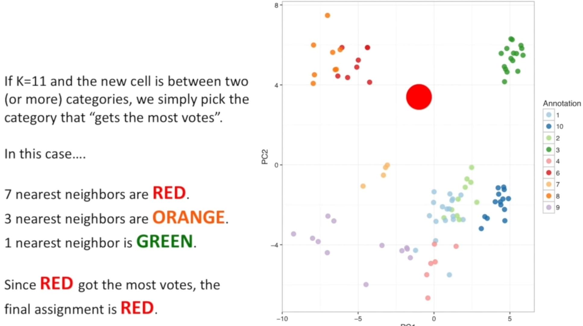 For example in the above image, the big red circle at first was unclassified and by using KNN it was classified by the nearest old classified data.