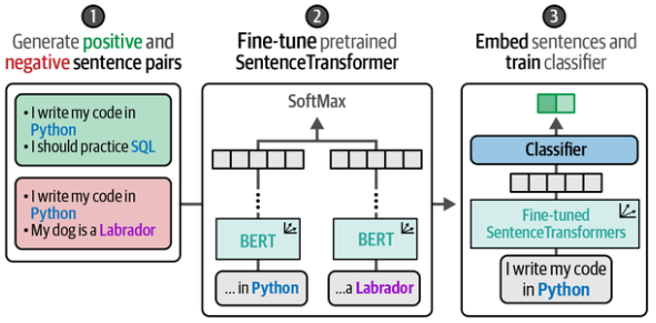 - Training a classifier: Create a classification head on top of the embedding model and train it using the previously generated training data