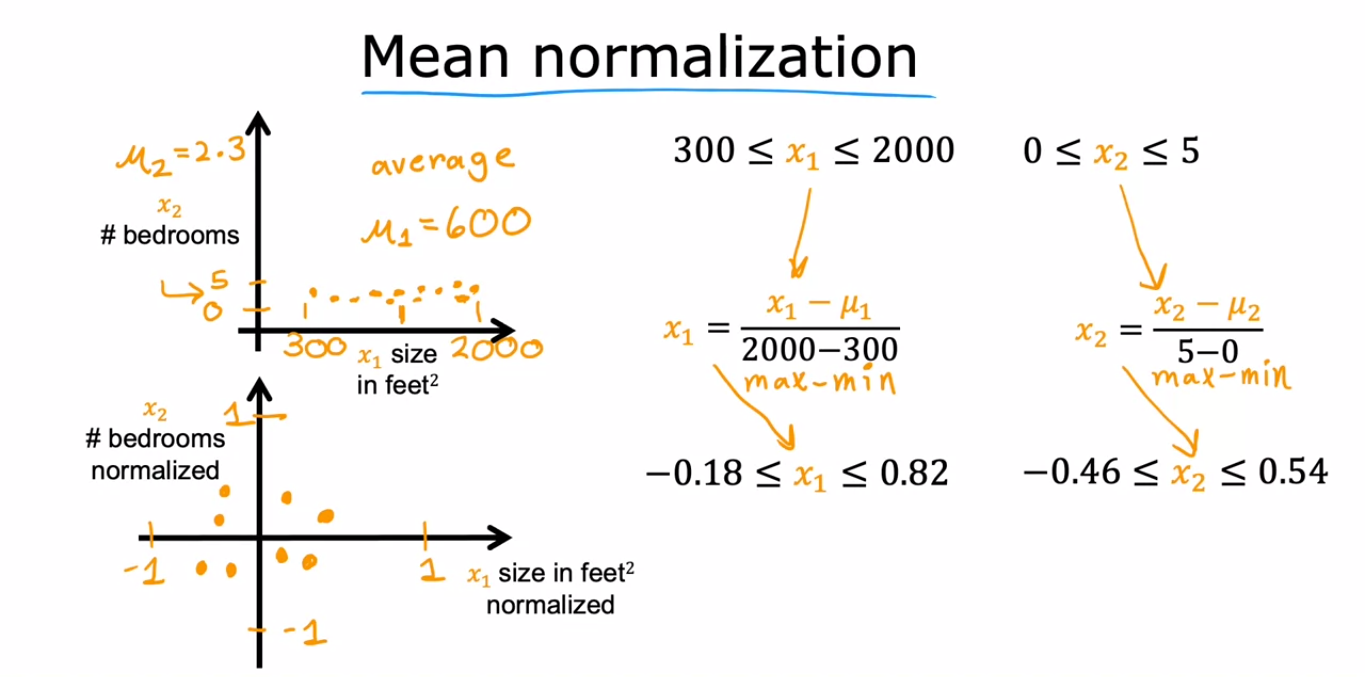 \[ x' = \frac{x - \bar{x}}{\max(x) - \min(x)} \]