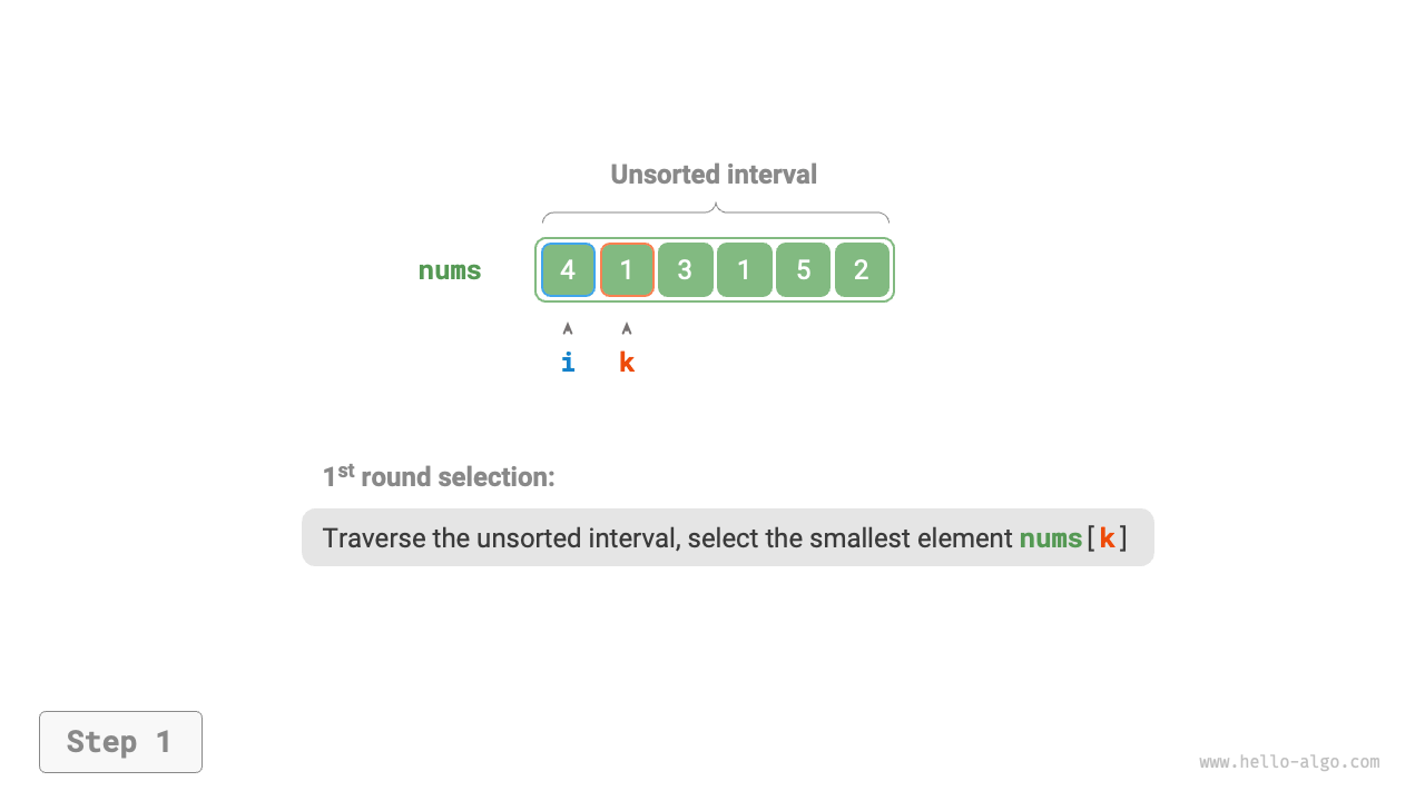 - Initially, all elements are unsorted, i.e., the unsorted (index) interval is \([0, n - 1]\).