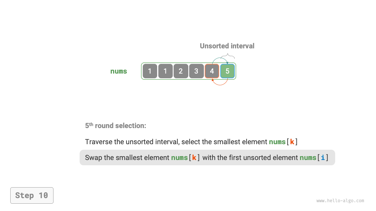 - Select the smallest element in the interval \([1, n - 1]\) and swap it with the element at index 1. After this, the first two elements of the array are sorted.