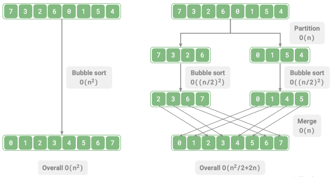 Taking "bubble sort" as an example, it requires \(O(n^2)\) time to process an array of length \(n\). Suppose we divide the array from the midpoint into two sub-arrays as shown in the figure below, such division requires \(O(n)\) time. Sorting each sub-array requires \(O((n / 2)^2)\) time. And merging the two sub-arrays requires \(O(n)\) time. Thus, the overall time complexity is: