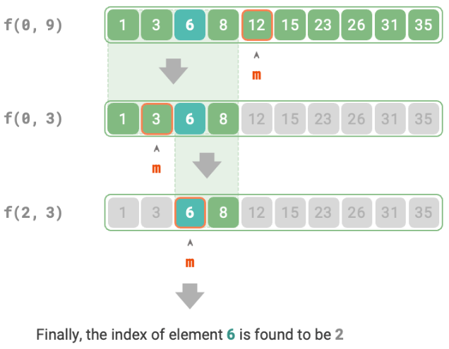 - Binary search: Binary search divides a sorted array into two halves from the midpoint index. And then based on the comparison result between the target value and the middle element value, one half is discarded. The search continues on the remaining half with the same process until the target is found or there is no remaining element.