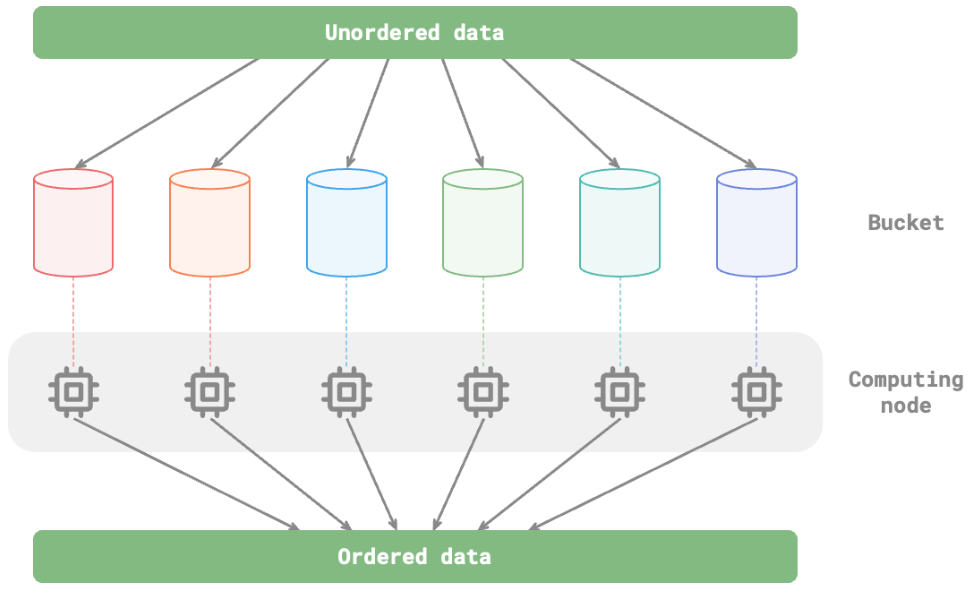 For example, in the "bucket sort" shown in the figure below, we break massive data evenly into various buckets. The jobs of sorting each bucket can be allocated to available computing units. Once all jobs are done, all sorted buckets are merged to produce the final result.