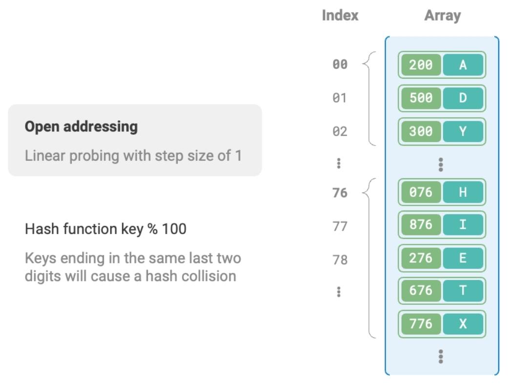 Open addressing does not introduce additional data structures but instead handles hash collisions through "multiple probing". Calculate the bucket index using the hash function, If the bucket already contains an element, linearly traverse forward from the conflict position (usually with a step size of 1) until an empty bucket is found, then insert the element.