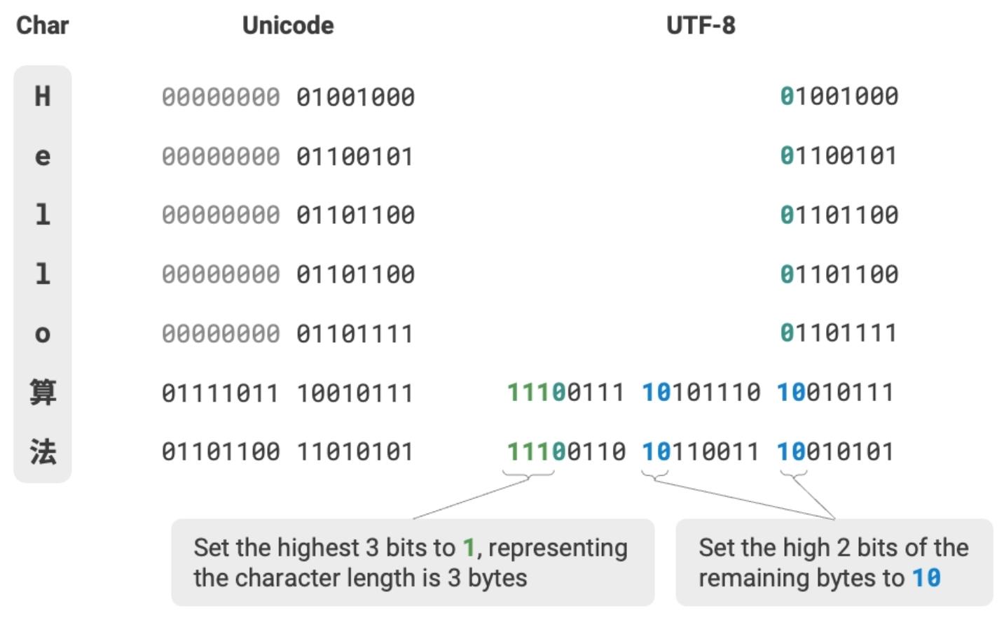 - UTF-16 encoding: Uses 2 or 4 bytes to represent a character. All ASCII characters and commonly used non-English characters are represented with 2 bytes; a few characters require 4 bytes. For 2-byte characters, the UTF-16 encoding equals the Unicode code point.