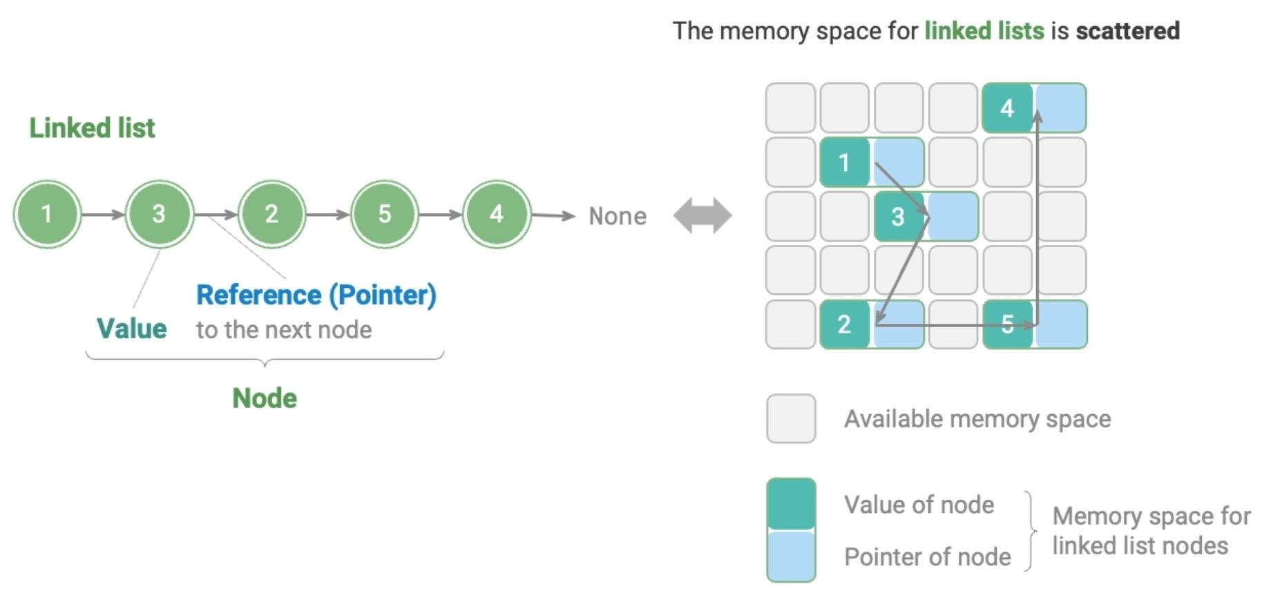 A linked list is a linear data structure in which each element is a node object, and the nodes are interconnected through "references". These references hold the memory addresses of subsequent nodes, enabling navigation from one node to the next.