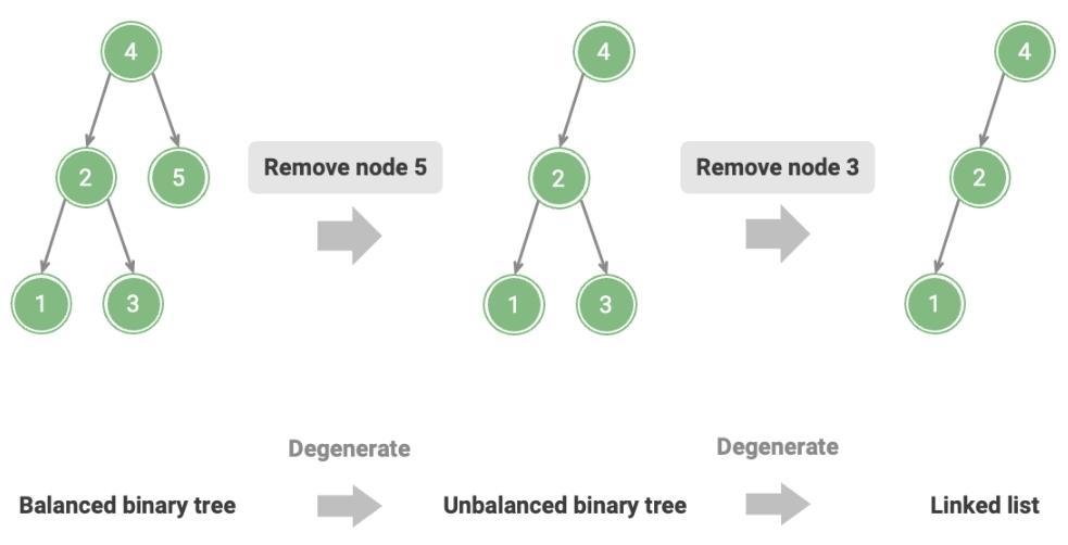 For example, in the following picture, after two node removal operations, this binary search tree will degrade into a linked list: