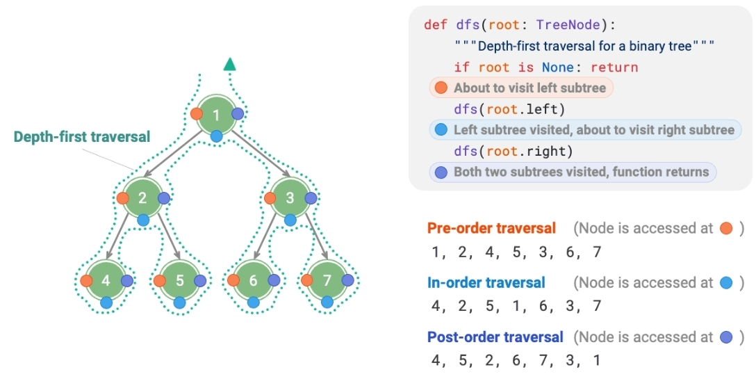 Depth-first traversal is like "walking" around the entire binary tree, encountering three positions at each node, corresponding to pre-order, in-order, and post-order traversal.