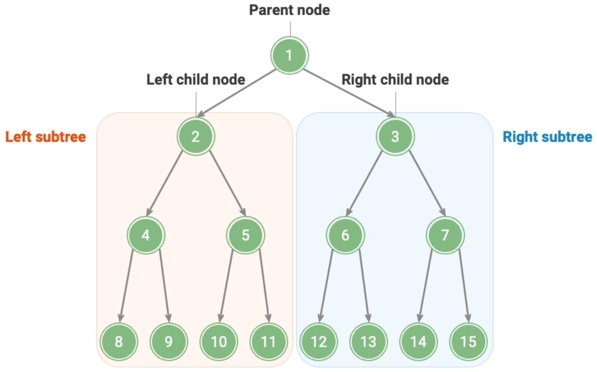 - Root node: The node at the top level of the binary tree, which has no parent node.