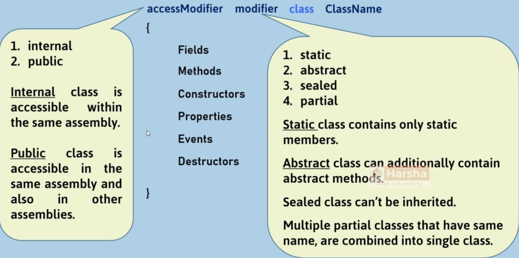 Feature | Normal Class | Abstract Class | Interface | Sealed Class | Static Class |